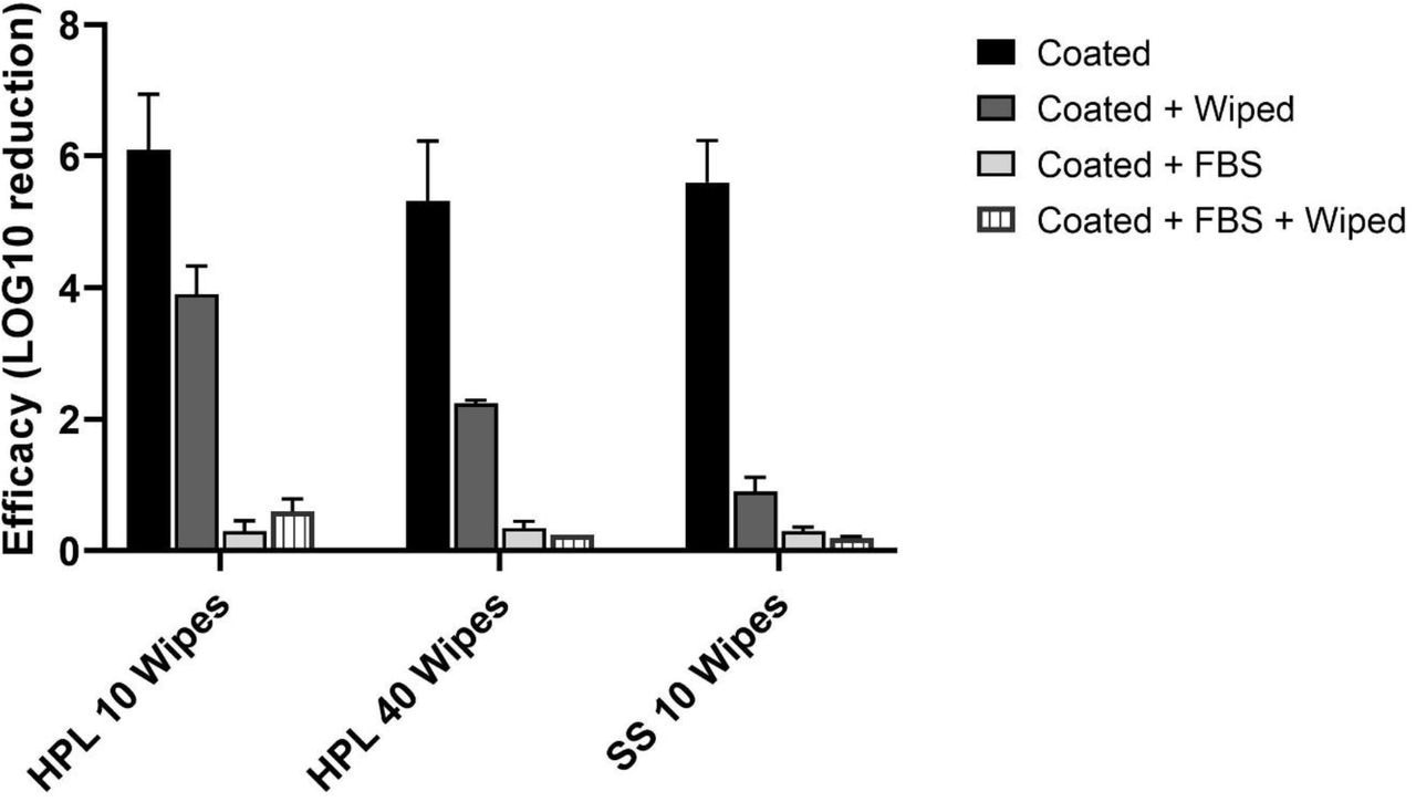 Since the product was designed to be used alongside regular cleaning, the researchers assessed whether wiping could affect the efficacy of the coating. In the presence of FBS, wiping with a wet cloth did not resume the product's efficacy, thus indicating that wiping with a damp cloth likely removed the coating from the surface.