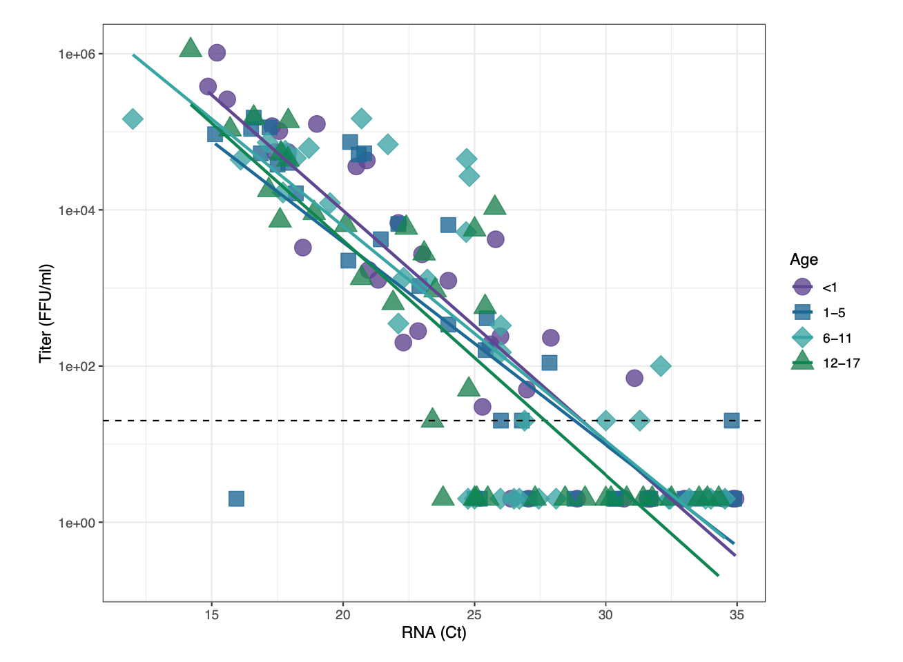 These results indicate that children are as infectious as adults at equivalent viral RNA loads. Notably, this does not account for changes in the SARS-CoV-2 variant responsible for the infection, which could lead to significant variation in infectivity. This is supported by the fact that many samples came from older adolescents who might be expected to closely resemble adults in their physiology.