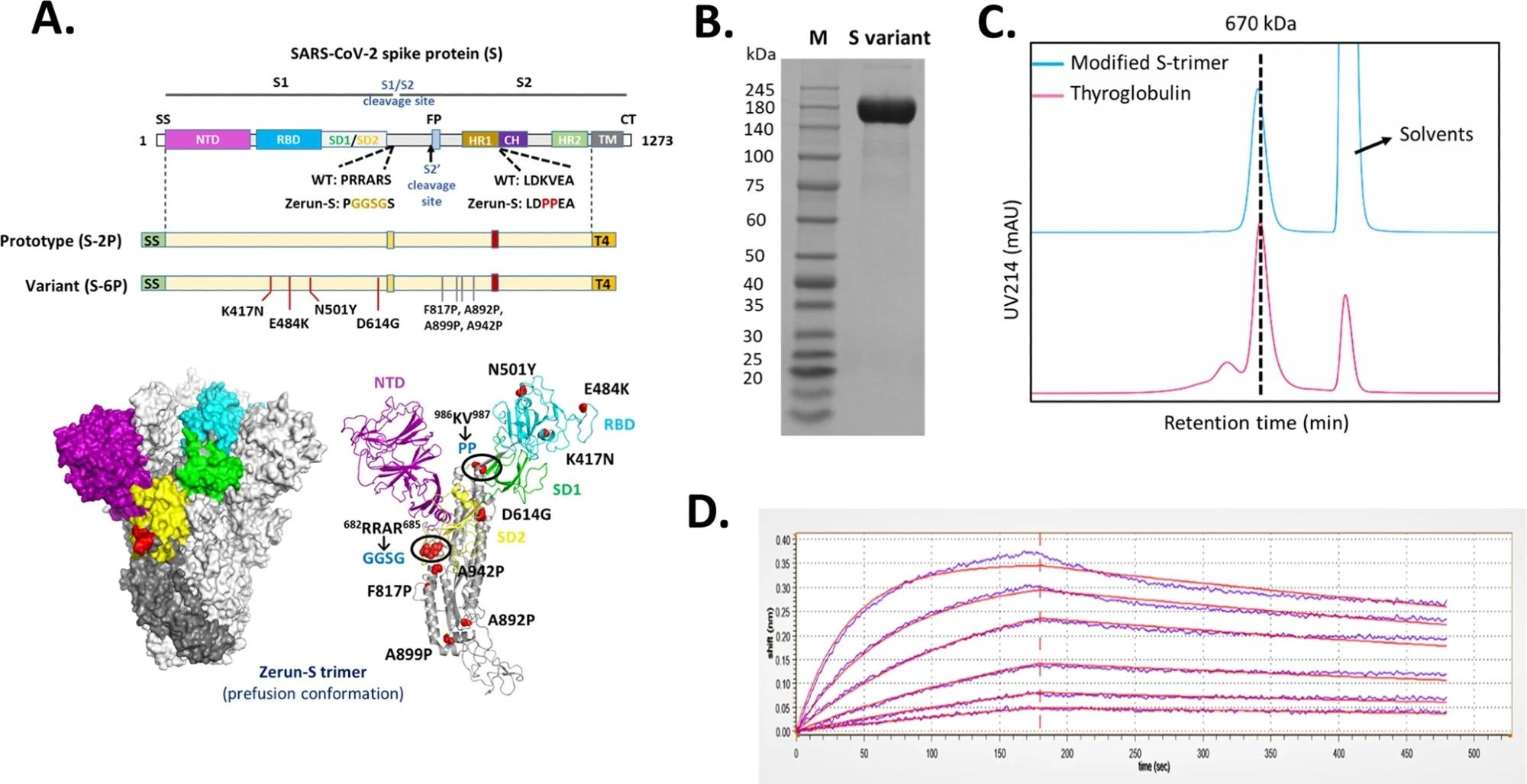 The trimeric conformation and purity of the modified spike protein were tested using sodium dodecyl sulfate-polyacrylamide gel electrophoresis (SDS-PAGE) and size-exclusion high-performance liquid chromatography (HPLC). The modified spike-trimer’s binding affinity to the human angiotensin-converting enzyme-2 (ACE-2) receptor and other kinetic properties were determined using biolayer interferometry assays.
