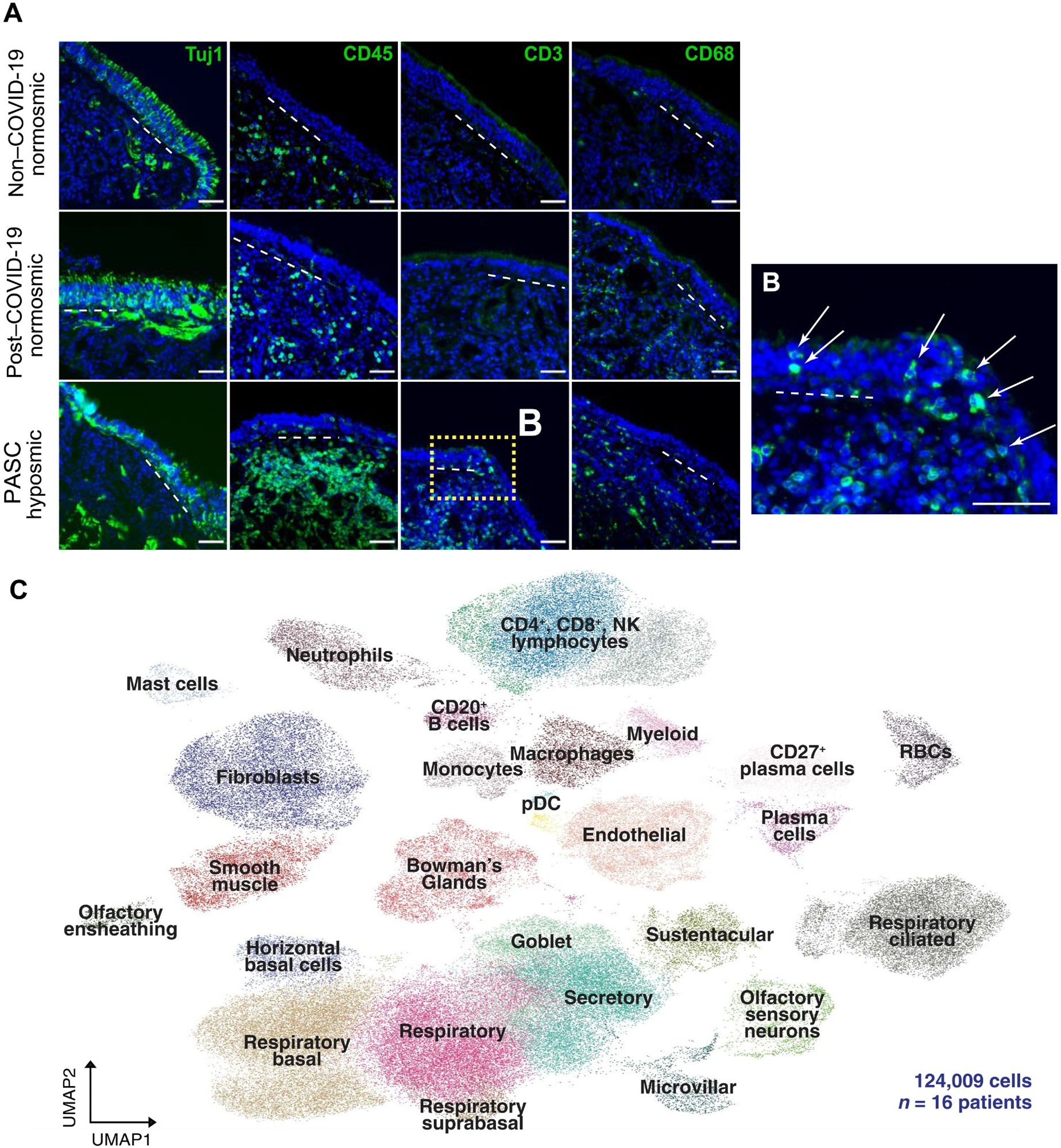 T cell infiltrates in nasal olfactory epithelial biopsies from PASC hyposmic patients. (A) Representative immunohistochemistry images of nasal biopsy tissue from normosmic non–COVID-19, normosmic post–COVID-19, or PASC hyposmic individuals. Tissue sections were immunostained for the TUJ1 neuronal marker, CD45 pan-immune cell marker, CD3 T cell marker, and CD68 myeloid cell marker. PASC hyposmic tissue showed dense CD45+ immune cell infiltration, including prominent CD3+ lymphocytic infiltration, which was absent in the normosmic groups; scattered CD68+ cells were present in all conditions. (B) The enlarged area (yellow box) from (A) shows CD3+ lymphocytes with prominent infiltration into the olfactory epithelium (white arrows); the dashed white line marks the basal lamina. Scale bar, 50 μm. (C) Additional nasal biopsies were processed for scRNA-seq to permit quantitative analyses. Uniform manifold approximation projection (UMAP) visualization of combined PASC hyposmic and control normosmic scRNA-seq datasets integrating 16 human nasal biopsies permitted robust cell cluster analysis and annotation. RBCs, red blood cells; pDC, plasmacytoid DCs.