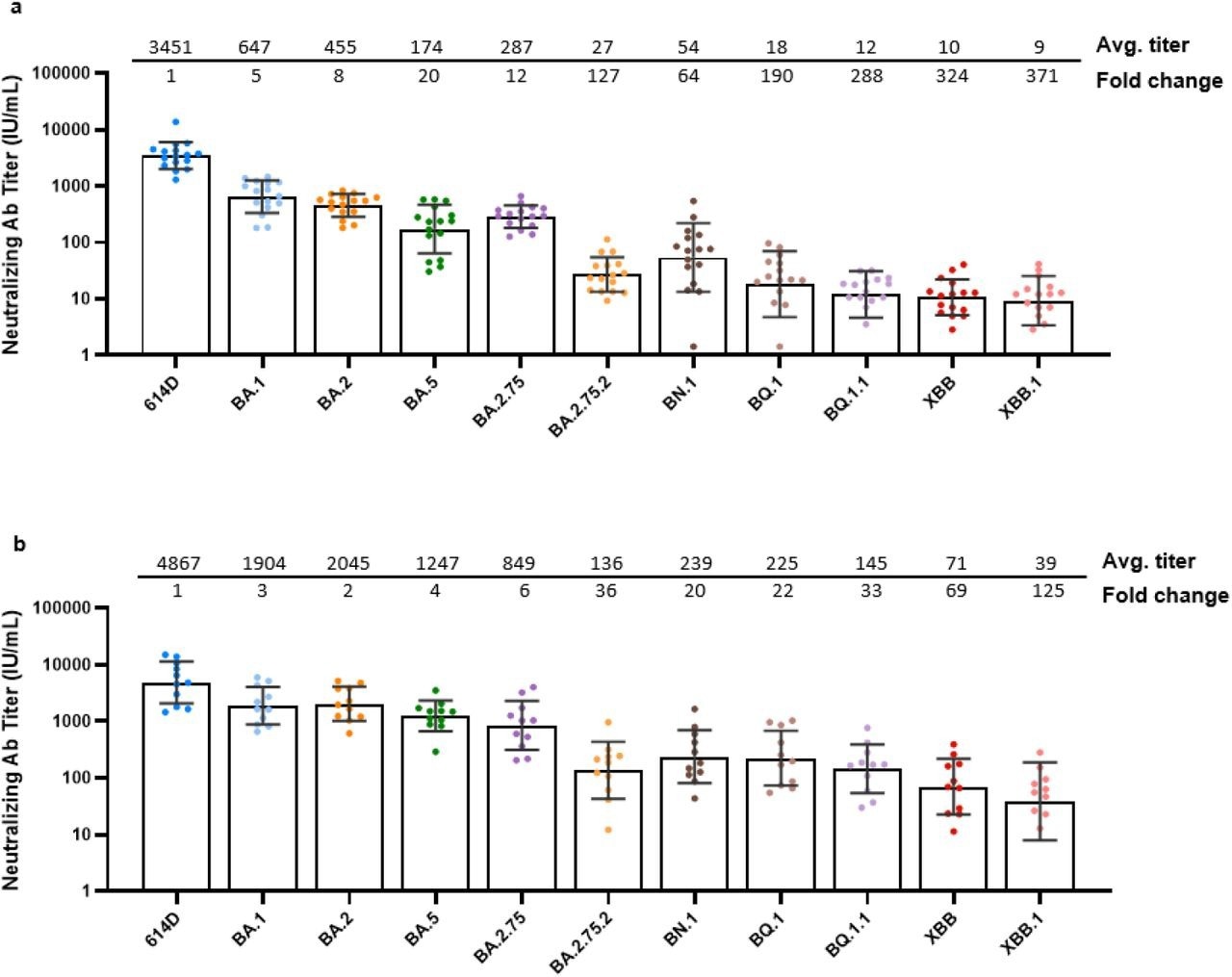 Neutralization activity of post-third (monovalent) dose sera and post-fourth (bivalent) dose sera against Omicron lineages. Each dot represents the neutralizing antibody titer (IU/mL) for each serum-virus pair. For statistical analysis, a two-tailed Wilcoxon matched-pairs signed-rank test was performed by comparing each variant with 614D. Test statistics and P value are summarized in Supplementary Table 2. The geometric mean of neutralizing antibody titer with geometric standard deviation and average fold-change with respect to the 614D reference virus are displayed across the top of each graph for: a, post-third dose sera (8 Pfizer-BioNTech BNT162b2 mRNA vaccine and 8 Moderna mRNA-1273 vaccine biologically independent post-third dose sera examined over 11 viruses); and b, post-fourth dose bivalent vaccine sera (N = 11 biologically independent post-fourth dose bivalent vaccine sera examined over 11 viruses). Average fold-change was calculated as the individual ratios of the geometric mean relative to 614D. Average neutralizing antibody titers in both sera for all lineages differ significantly (P < 0.001) from 614D (Supplementary Table 2). Virus lineage names are displayed across the bottom of each graph.