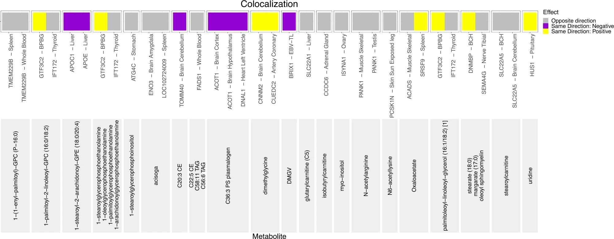 The direction of the effect of minor allele on metabolite levels and gene expression is shown in the legend. At the bottom of the graph, in light gray, are the names of the metabolites. Above the names of metabolites are eQTL gene-tissue pairs. If both the effect of minor allele on metabolite levels and on gene expression is more than 0, such variant-metabolite-gene eQTL combinations are marked in yellow and annotated as “Same Direction: Positive”. If the effect of minor allele on metabolite levels and on gene expression is less than zero, such variant-metabolite-gene eQTL combinations are marked in purple and annotated as “Same Direction: Negative.” If the effect of minor allele on metabolite levels is less than zero and the effect of minor allele on gene expression is more than zero, or vice versa, such variant-metabolite-eQTL combinations are marked in gray and annotated as “Opposite Direction”. Additionally, the following acronyms were used for tissues: BPBG brain putamen basal ganglia, BCH brain cerebellar hemisphere, EBV-TL - Cells EBV-transformed lymphocytes.