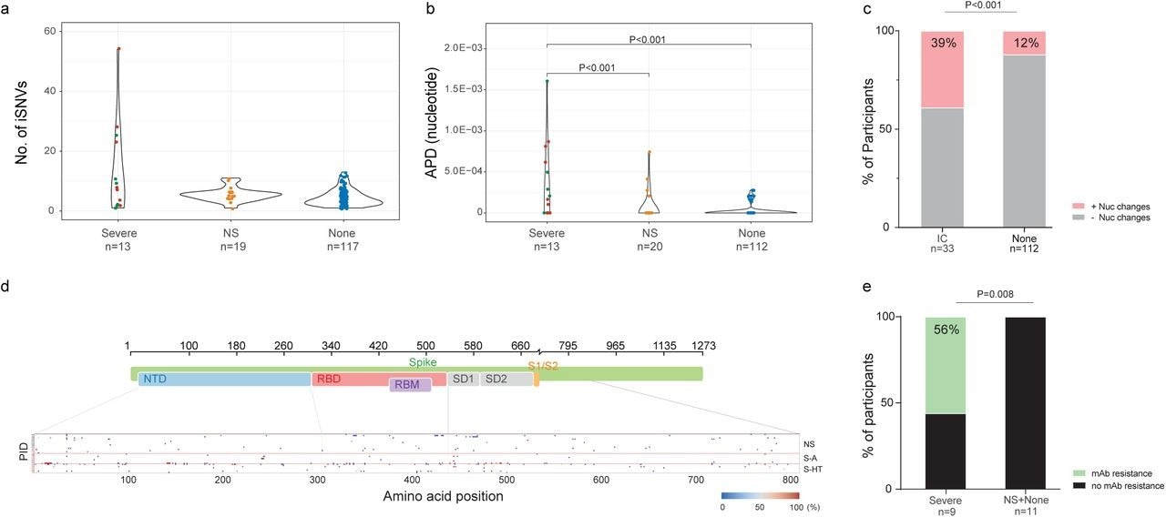 Among individuals with longitudinal SARS-CoV-2 sequences, 39% and 12% of immunosuppressed and non-immunosuppressed individuals, respectively, exhibited nucleotide changes in the SARS-CoV-2 S gene. Severely immunosuppressed individuals were associated with a greater evolution of SARS-CoV-2 and increased risk of resistance to anti-SARS-CoV-2 therapies. Among severely immunosuppressed individuals, 56% developed mAb-targeted resistance mutations at a significantly higher rate than those observed in other groups.