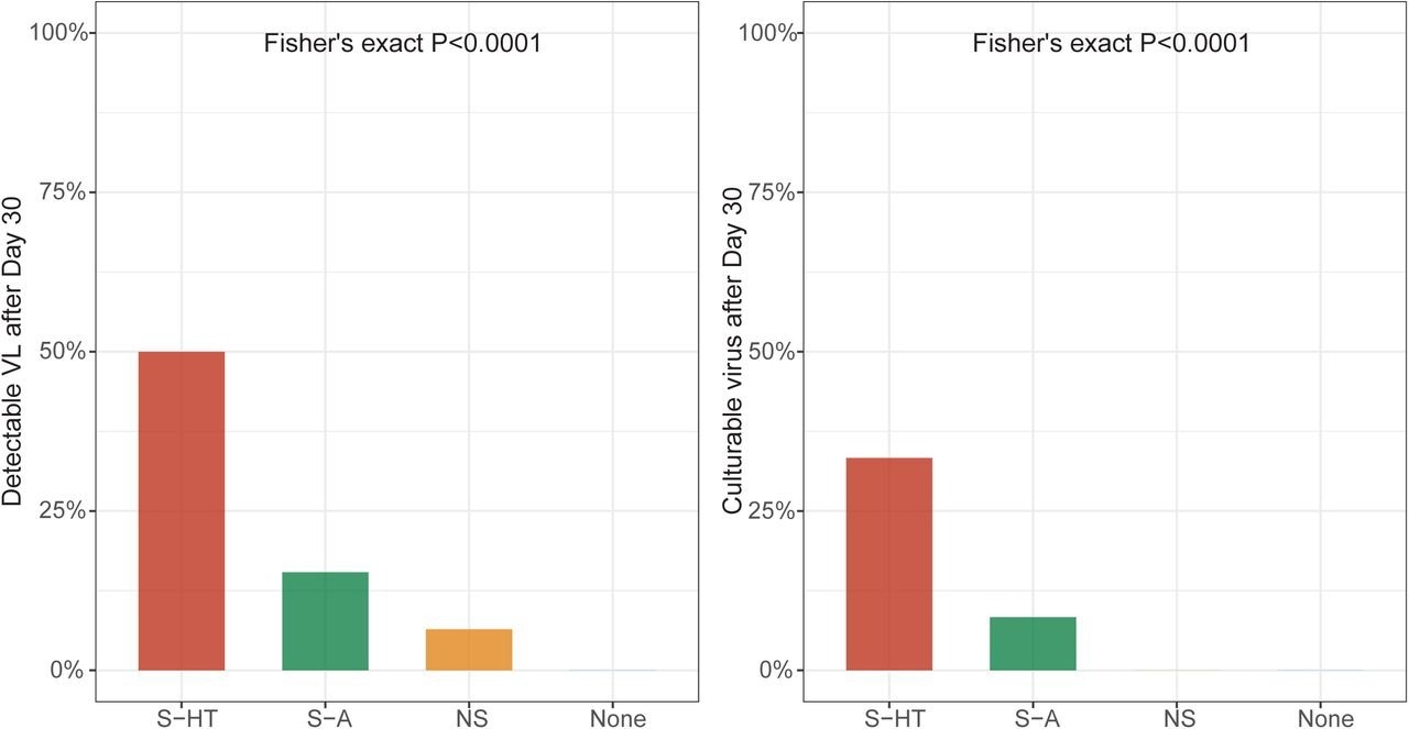 The median duration for nasal SARS-CoV-2 RNA clearance by S-HT individuals was 72 days, which was significantly longer than those by S-A, NS, and non-immunosuppressed individuals at seven, 11, and 11 days, respectively. Likewise, S-HT individuals exhibited significantly delayed culturable SARS-CoV-2 clearance at 21 days as compared to 6.5, six, and seven days for S-A, NS, and non-immunosuppressed individuals, respectively.