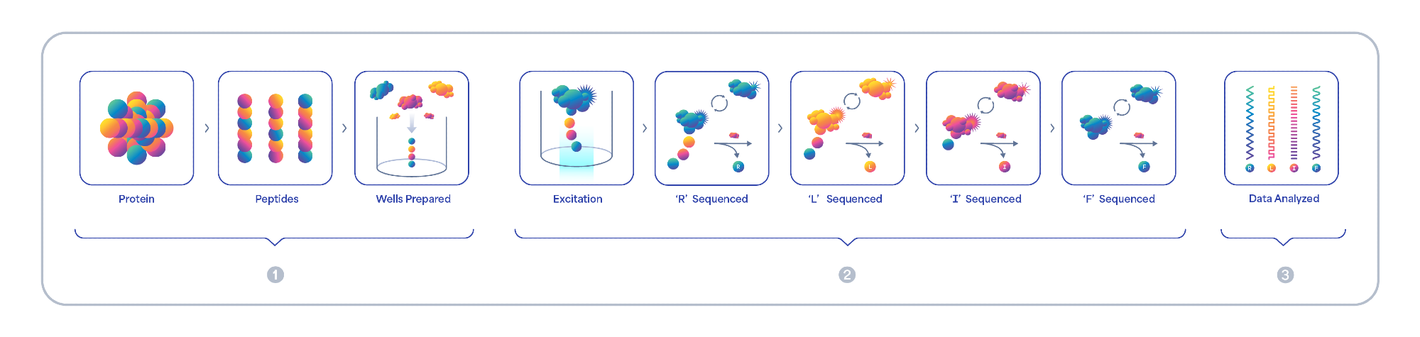 Figure 1. Platinum’s easy-to-use, end-to-end solution includes everything you need to 1) prepare, 2) sequence and 3) analyze proteins with seamless integration into existing workflows. The Platinum workflow begins with protein digestion and immobilization of peptides on a semiconductor chip. Fluorescently labeled N-terminal amino acid (NAA) recognizers bind each NAA and the binding intensity and kinetics are captured as a unique kinetic signature for each NAA. Aminopeptidases cleave NAAs exposing the next NAA for sequencing. On-off binding reveals the amino acid sequence in each diverse peptide. Data is securely transferred and analyzed using an intuitive Cloud based software which aligns and translates kinetic signatures to protein identification.