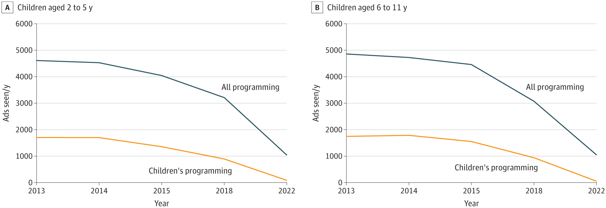 Throughout the study period, the annual viewership of advertisements decreased by 78% for children between two and five years of age and 79% for those between six and eleven years of age. Annual advertising on pediatric programming declined by 95% and 97% for two—to five-year-olds and six—to eleven-year-olds, respectively.