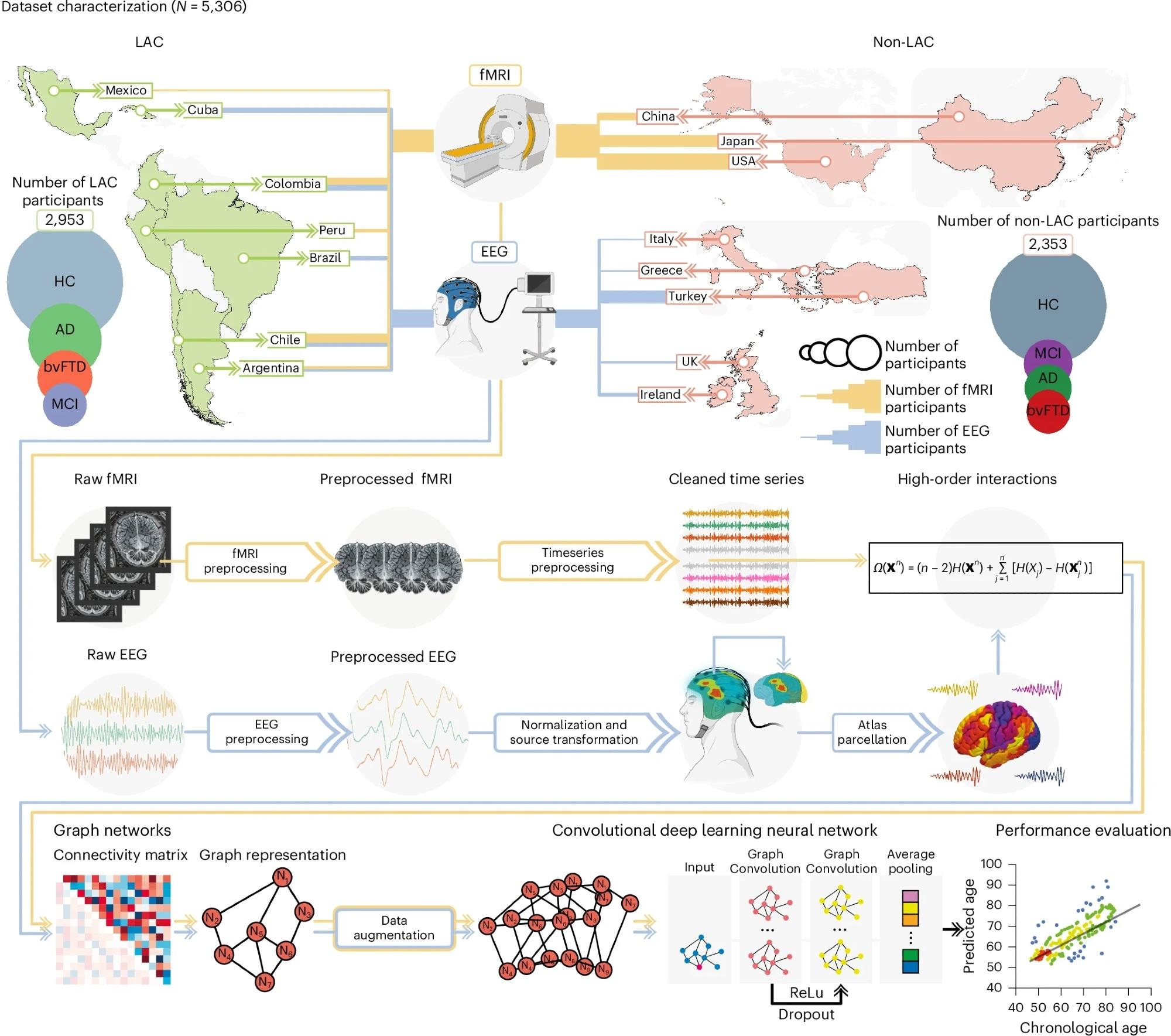 The study analyzed resting-state fMRI and EEG datasets of 5,306 participants across 15 countries in the LAC and non-LAC regions. fMRI data were collected from 2,953 participants in Argentina, Chile, Colombia, Mexico, Peru, the United States of America, China, and Japan, while EEG data were gathered from 2,353 participants in Argentina, Greece, Brazil, Chile, Colombia, Cuba, Ireland, Italy, Turkey, and the United Kingdom. The participants included 3,509 healthy controls and 1,808 with neurocognitive disorders, namely mild cognitive impairment (MCI), AD, or behavioral variant frontotemporal dementia (bvFTD). The data underwent rigorous preprocessing, including normalization, noise correction, and source space estimation. High-order interactions between brain regions were assessed, with data converted into graphs for analysis via graph convolutional networks (GCNs). An approach involving 80% cross-validation and 20% hold-out testing was used. Data augmentation techniques were employed, and the model’s predictive performance was evaluated using goodness of fit (R²) and root mean square error (r.m.s.e). Gradient-boosting models were used to explore the influence of exposome factors on brain-age gaps. Extensive statistical analyses were conducted to validate the findings, including permutation tests and bootstrapping. Data quality was carefully assessed, and the study adhered to strict ethical guidelines.