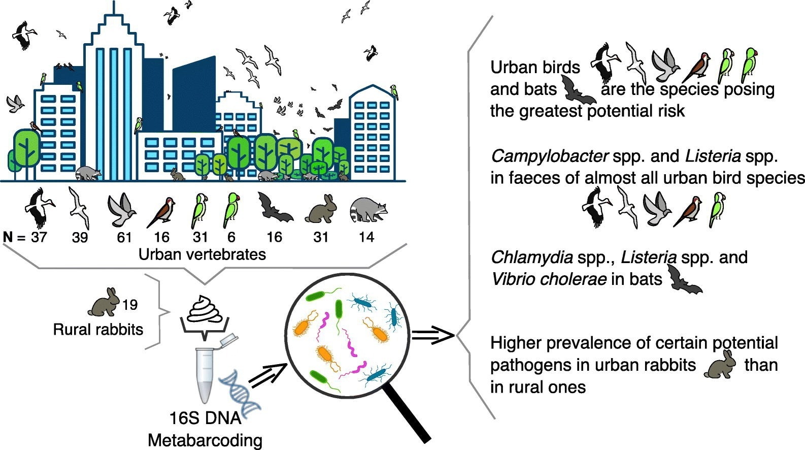 Among the studied urban vertebrate species, bats were identified as the most frequent hosts of potentially zoonotic pathogens, followed by storks, pigeons, and sparrows. Among the identified zoonotic species of high relevance, Campylobacter and Listeria were detected in birds, whereas Chlamydia and Vibrio cholerae were detected in bats.
