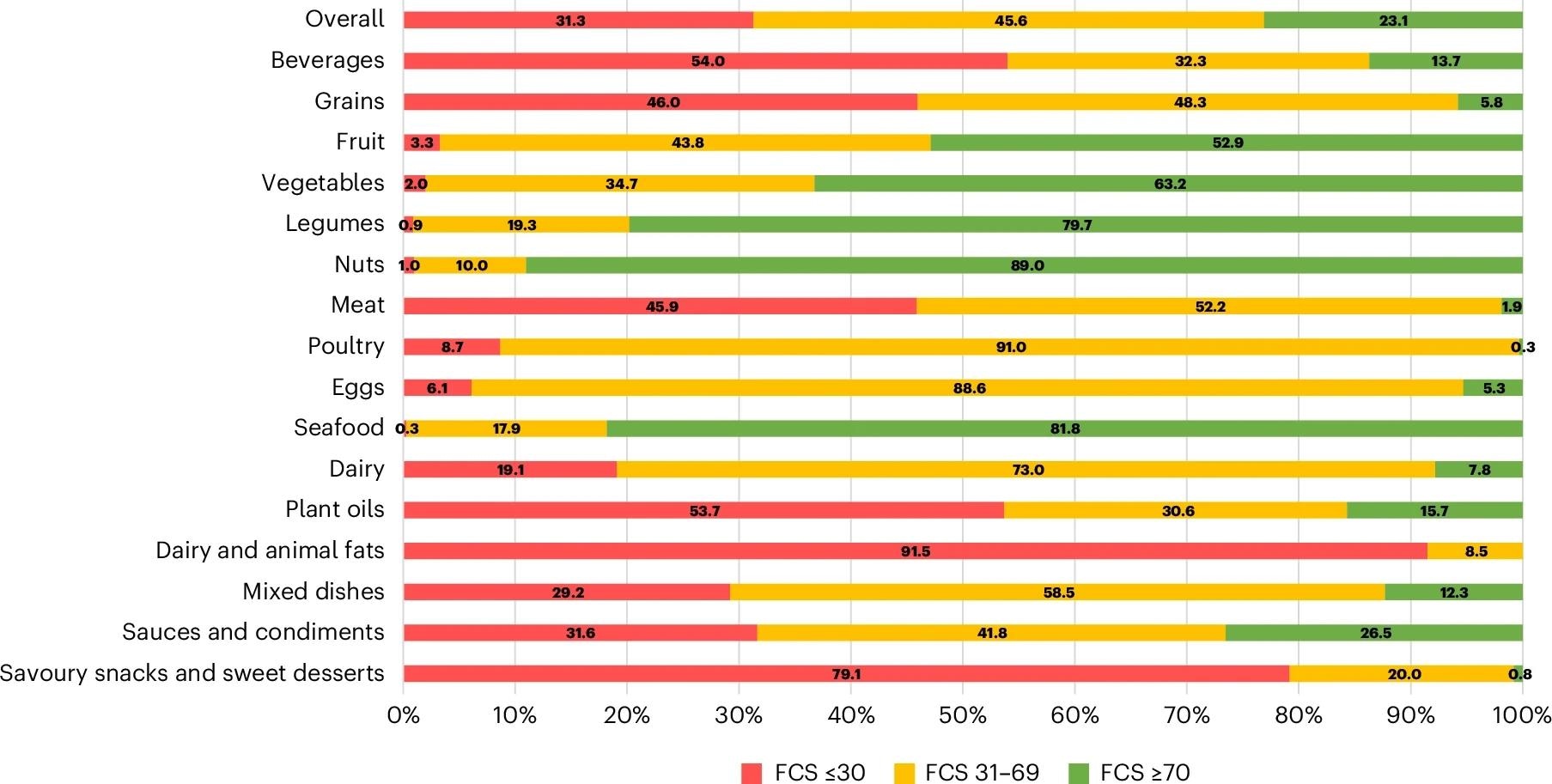 Variations in FCSs were also observed within certain food subcategories. For example, a whole fried egg without fat exhibited an increased FCS from 48 to 62, whereas an egg substitute decreased in score from 50 to 45. Most legumes, seafood, nuts, vegetables, and fruits scored 70 or more, whereas minimal scoring items often included those with high added sugars or other additives.