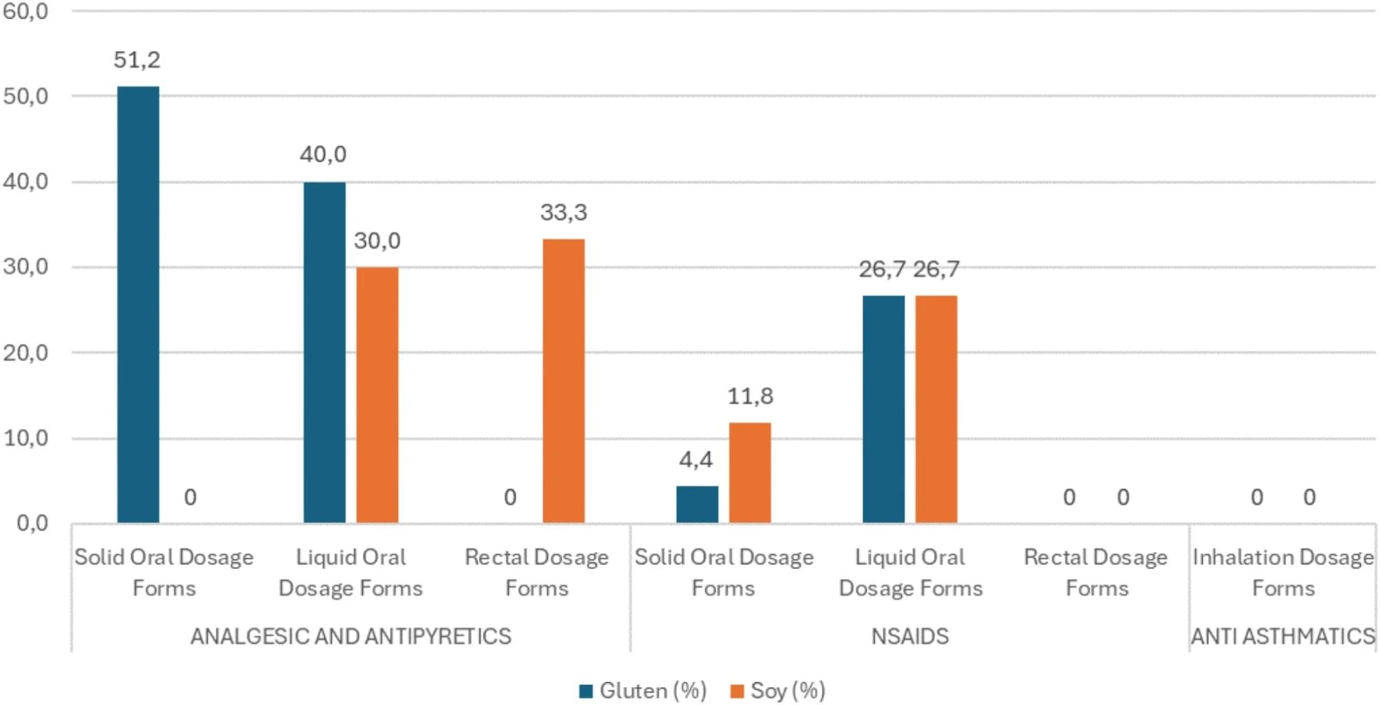 A total of 308 medicinal products were analyzed. These included 108 antipyretics and analgesics, 115 bronchodilators and anti-asthmatics, and 85 NSAIDs. Sodium carboxymethyl starch and pregelatinized starch were the predominant gluten-derived excipients, while xanthan gum and soy were the most common soy-derived excipients. Xanthan gum and soy were almost exclusively present in NSAIDs, antipyretics, and analgesics.