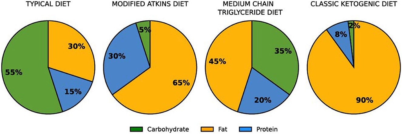 KD is characterized by a higher intake of fats, moderate intake of proteins, and lower consumption of carbohydrates. The low dietary carbohydrate maintains the predominant oxidation of fatty acids, mimicking the state of starvation that involves ketogenesis in the liver. Ketogenesis involves the synthesis of ketone bodies, such as acetone, β-hydroxybutyrate, and acetoacetate, which serve as an alternative fuel source for cells.