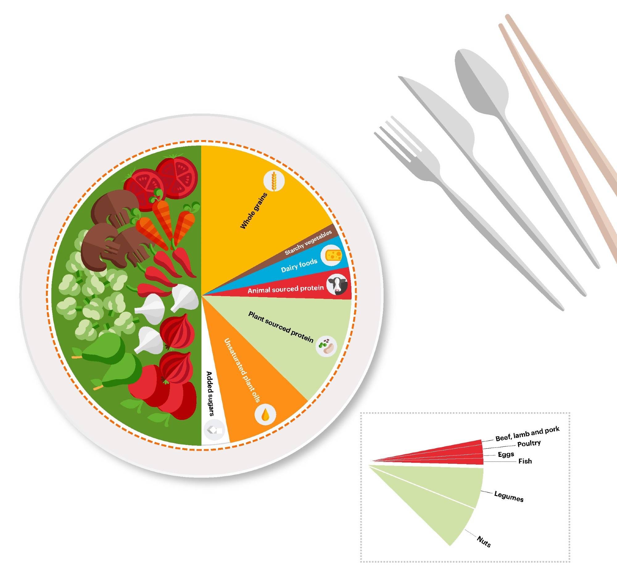A planetary health plate should consist, by volume, of approximately half a plate of vegetables and fruits; the other half, displayed by contribution to calories, should consist primarily of whole grains, plant protein sources, unsaturated plant oils, and (optionally) modest amounts of animal sources of protein. For further details, please refer to section 1 of the Commission. Image Credit: EAT
