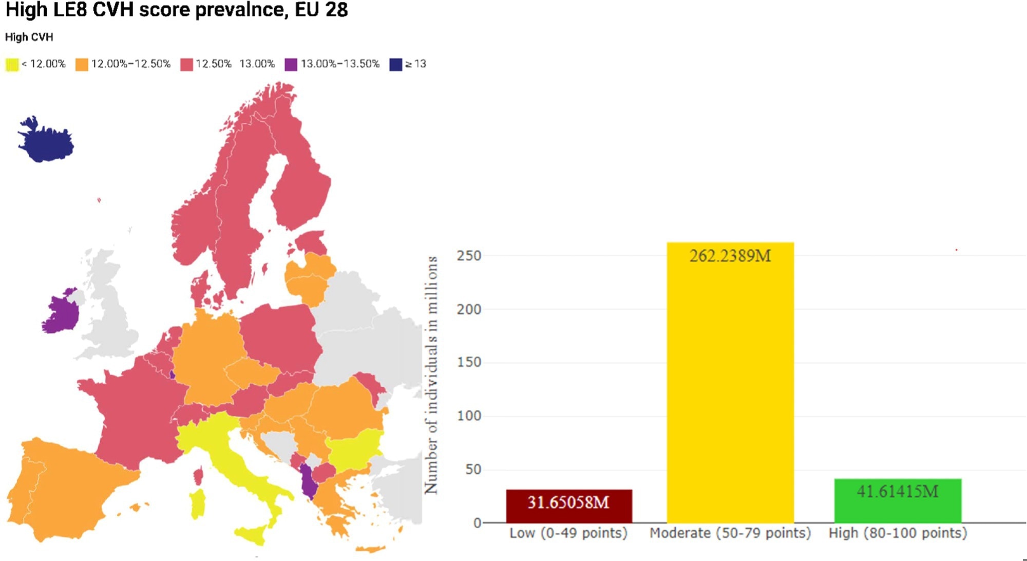 Age-standardized Life's Essential 8 score in EU 28 countries. Plot showing expected high CVH score prevalence (left panel) and distribution of low, moderate and high CVH scores in EU 28 (right panel). Life's Essential 8 score (LE8) ranges from 0 to 100 and is composed of eight cardiovascular health metrics: diet, physical activity, nicotine exposure, Body Mass Index, sleep health, blood glycemia, blood pressure, and blood lipids. LE8 CVH levels: Low LE8 (0–49 points), intermediate (50–79 points), and high (80–100 points). Age-standardized LE8 level prevalences and the expected number of individuals by CVH level were estimated using the EU 28 population as of January 1st, 2022.