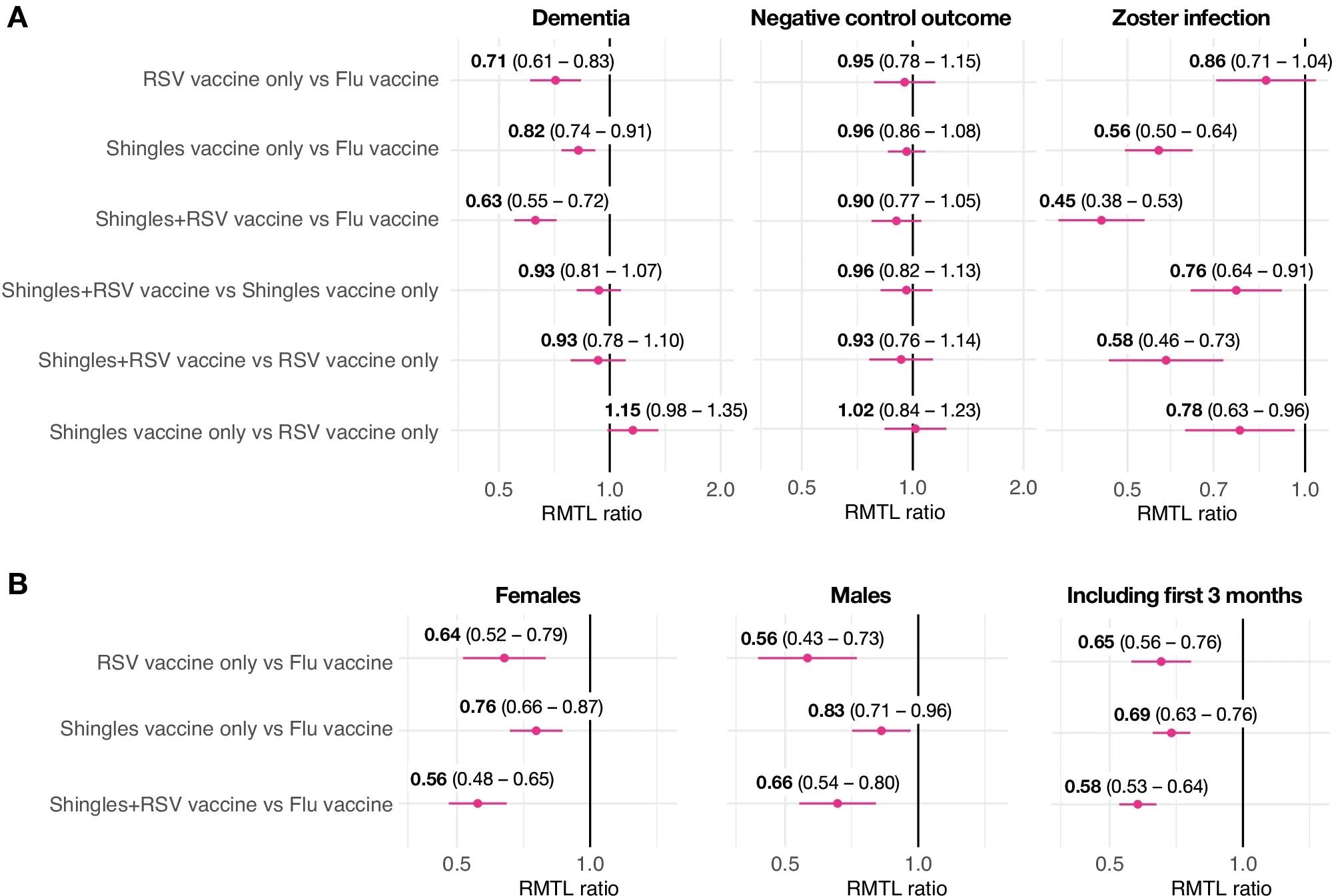 A. Association between AS01-adjuvanted vaccines and risk of dementia, negative control outcome, and zoster infection. Each dot and bold number represent the ratio of restricted mean time lost (RMTL) for the comparison between two cohorts, while horizontal lines and numbers in brackets are 95% confidence intervals. RMTL ratios below 1 indicate that the risk is lower in the first cohort (e.g., recipients of the RSV vaccine on the first line) than in the second (e.g., recipients of the flu vaccine). B. Associations between AS01-adjuvanted vaccines (compared to flu vaccine) and risk of dementia in females, males, and in the cohorts including people who developed dementia within the first 3 months post-vaccination.