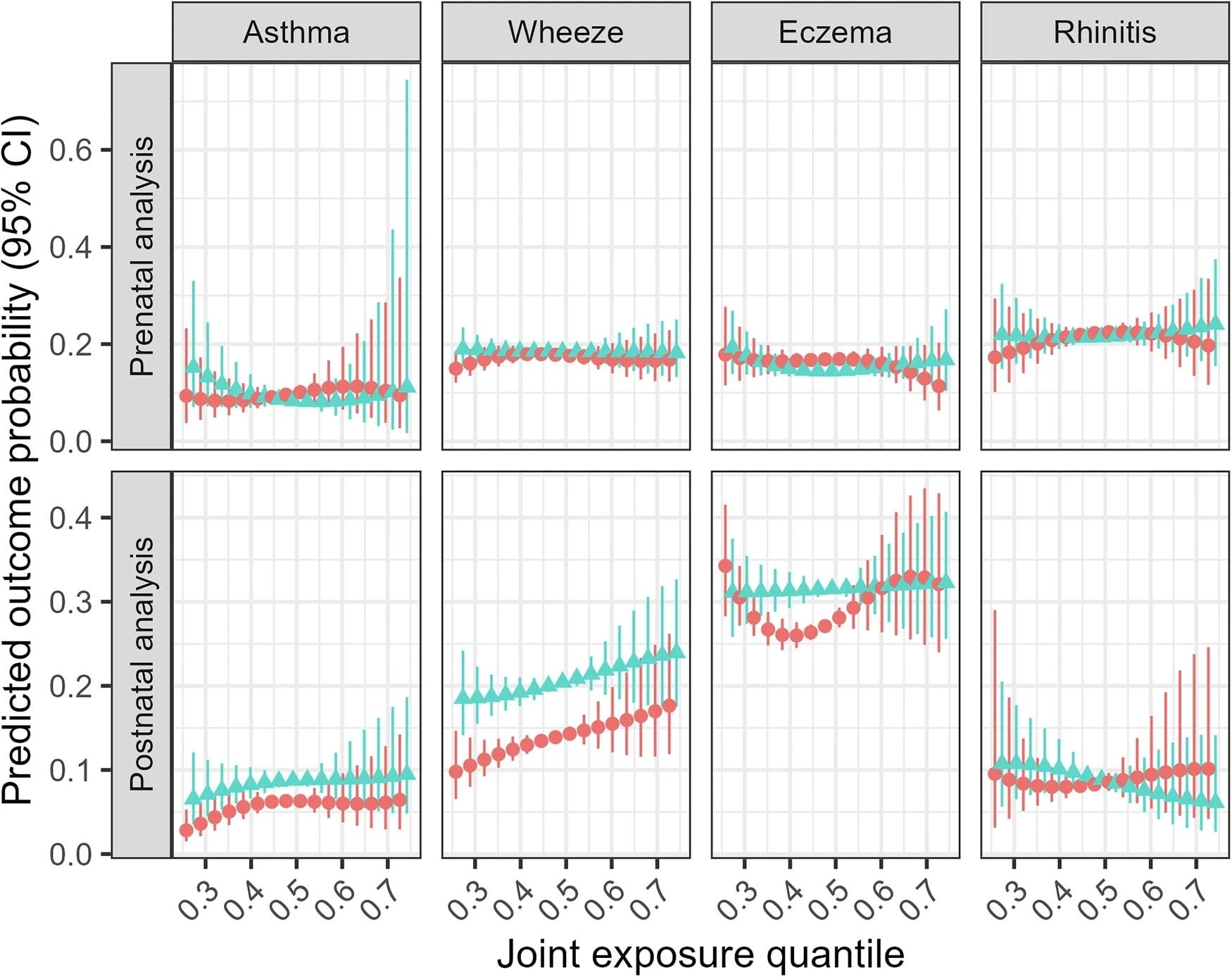 Multivariate dose‒response relationship between the overall chemical mixture and childhood allergic conditions stratified by sex. Red circles: Females. Blue triangles: Male. Models obtained with quantile G-computation. Prenatal analysis models adjusted for cohort membership, maternal age, ethnicity, parental education, marital status, family history of asthma, prenatal tobacco smoke exposure, and season of birth. Postnatal analysis models were further adjusted for breastfeeding duration, age at outcome assessment, postnatal smoke exposure and gestational age.