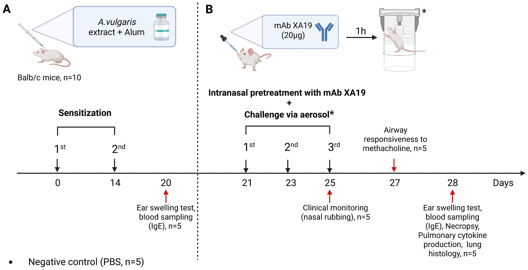Study design. The schematic illustration shows the sensitization of mice with Artemisia vulgaris pollen extract (A), intranasal pretreatment with the monoclonal antibody XA19 and following subsequent allergen challenge (B).