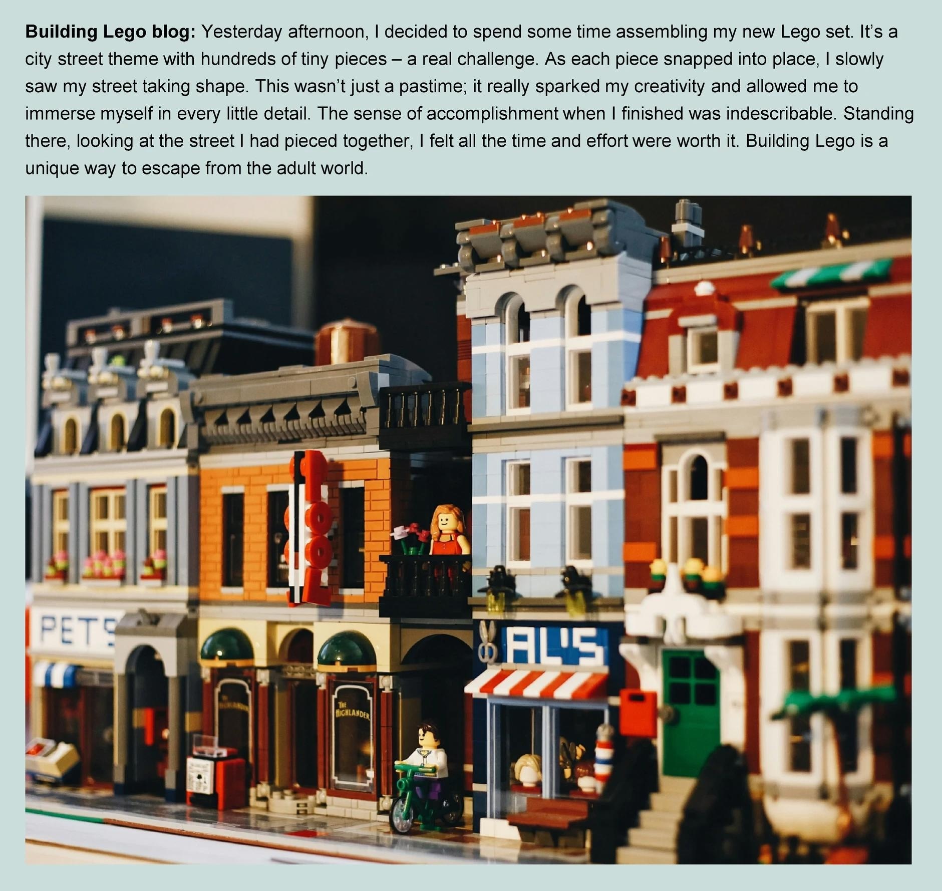An example showing the Building Lego blog with its corresponding image. From Alphacolor (2017). [White and multicolored building scale mode]. Unsplash. https://unsplash.com/photos/ipmwlGIXzcw.