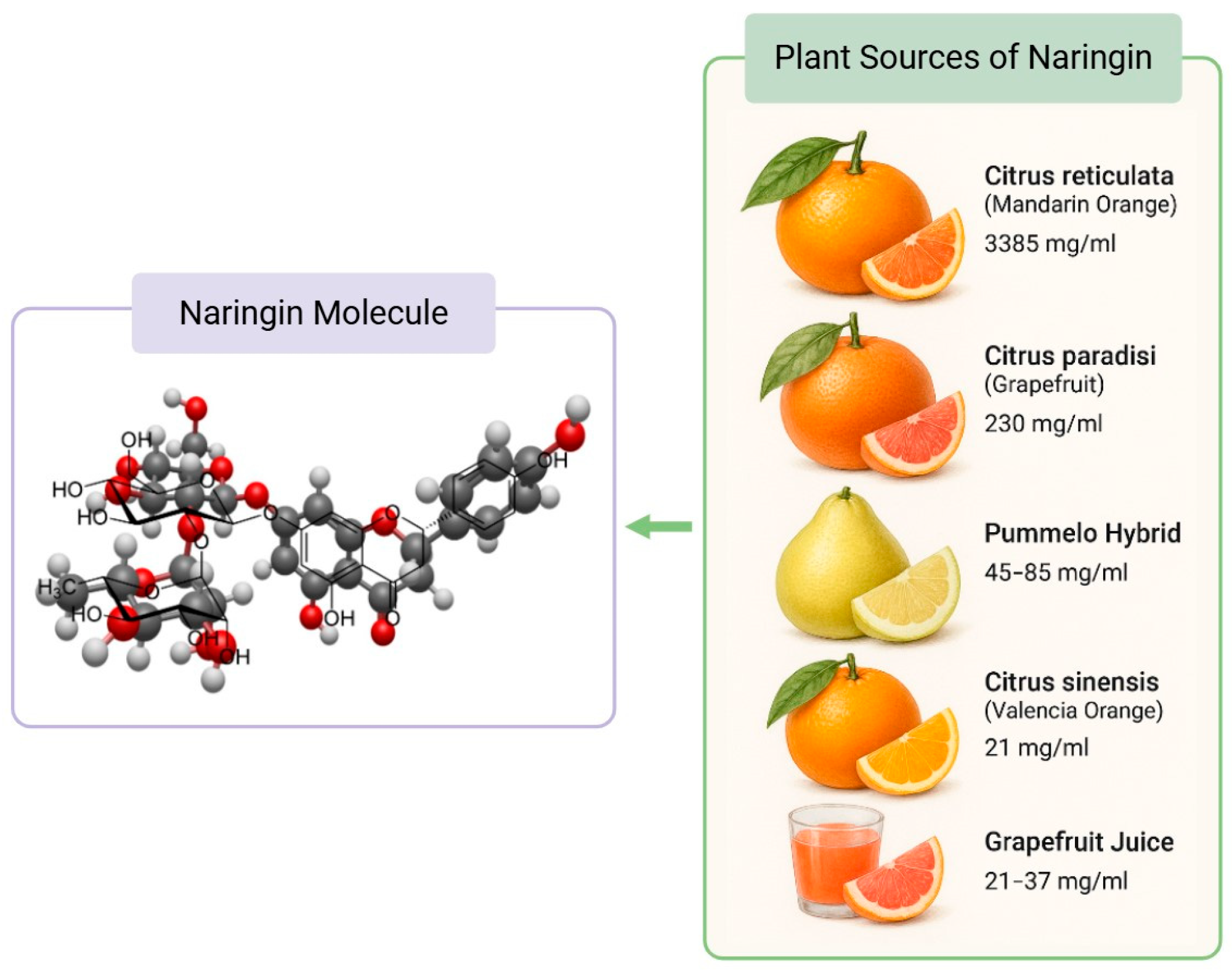 Naringin Molecular Structure and Citrus Food Sources. The concentration of naringin in plant sources were obtained from Alam et al.