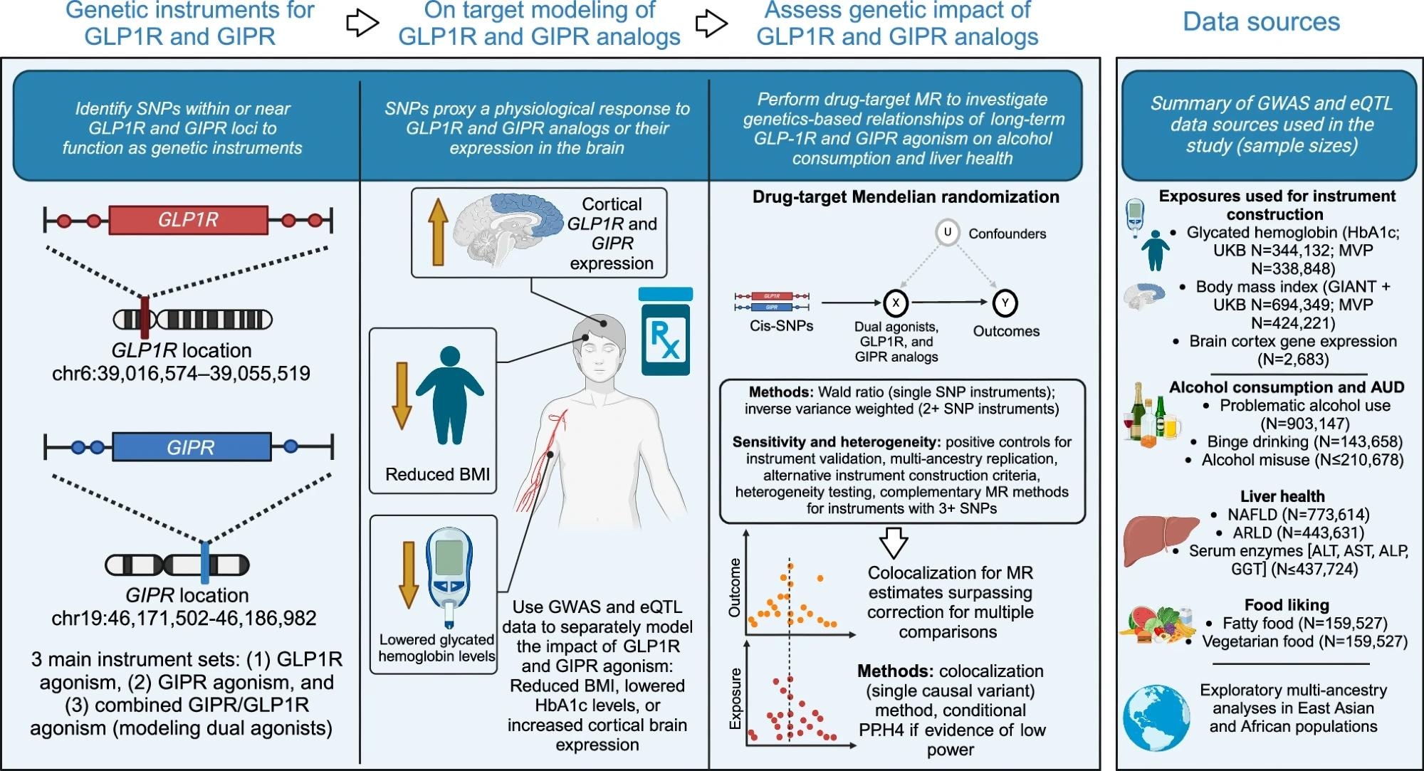 ![This study used summary-level GWAS data relating to glycated hemoglobin (HbA1c) and body mass index (BMI) to construct genetic instruments modeling GLP1R and GIPR agonism. We constructed three instrument types: one that proxies GLP1R agonism, one that proxies GIPR agonism, and one combined instrument that proxies dual GLP1R and GIPR agonism. Each instrument type included multiple exposure sources mimicking the expected physiological responses to pharmacological modulation of the targets (lowered glycated hemoglobin [HbA1c], reduced body mass index [BMI], and GLP1R or GIPR gene expression in the cortex). Instrument sets for each BMI and HbA1c exposure were constructed in two independent GWAS summary statistics (UK Biobank [plus GIANT for BMI] and the Million Veterans Program [MVP]). After instrumentation and validation with the primary clinical indications for GLP1R and GIPR agonism (type 2 diabetes and obesity), and assessing their impact on liver health, we obtained a selection of outcomes related to alcohol use disorder (AUD) and alcohol consumption behavior to assess the impact of GLP1R and GIPR agonism. We contextualized the alcohol-related analyses by analyzing other substance use disorders and investigating outcomes related to self-reported food liking. Because of the availability of large sample sizes and the most relevant endpoints, we used data from European ancestry as the main analysis set, but we also performed analyses using East Asian and African ancestry data sources. Finally, for all drug-target MR estimates demonstrating evidence of a relationship (main drug-target MR method P < 0.05), we performed colocalization analyses to assess evidence of shared causal variants between the biomarker exposures and outcomes in the GLP1R and GIPR genomic loci. MR Mendelian Randomization, GLP1R Glucagon-like peptide-1 receptor, GIPR glucose-dependent insulinotropic polypeptide receptor, NAFLD Non-alcoholic fatty liver disease, ALD Alcohol-related liver disease, SNP Single nucleotide polymorphism, BMI Body mass index.](https://www.appetitescience.com/images/news/ImageForNews_819064_17579104991808397.jpg)