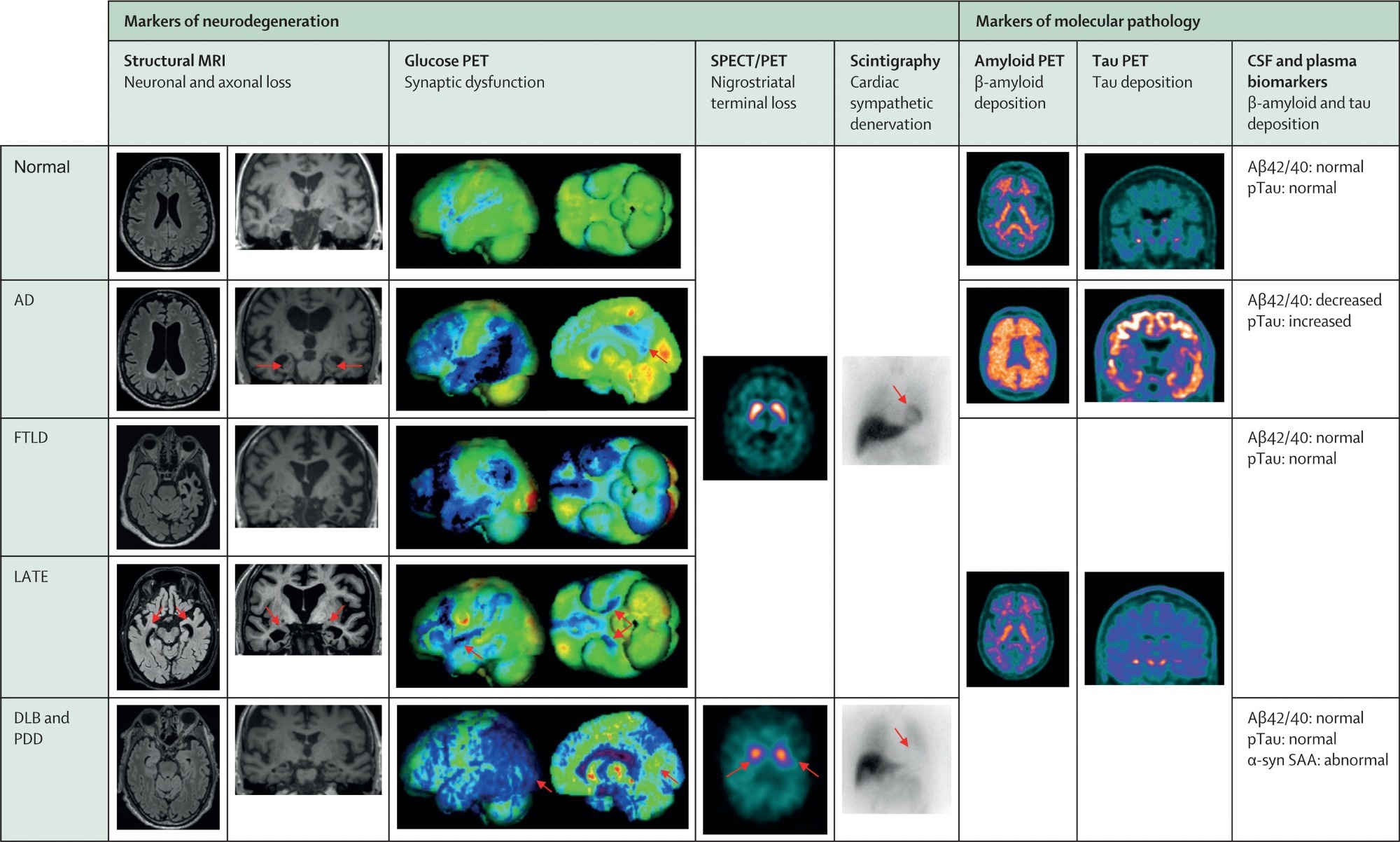Typical biomarker profiles across pure pathology neurodegenerative cognitive disorders. Blue colour in glucose PET renderings denotes substantial hypometabolism. Orange/red/purple/white colours in nigrostriatal SPECT imaging and amyloid and tau PET denote increased tracer uptake. Images come from the archive of one of the co-authors (VG). AD=Alzheimer's disease with typical amnestic phenotype. CSF=cerebrospinal fluid. DLB=dementia with Lewy bodies. FTLD=frontotemporal lobar degeneration with behavioural phenotype. LATE=limbic-predominant age-related TDP-43 encephalopathy. PDD=Parkinson's disease dementia. SAA=seed amplification assay. SPECT=single-photon emission computed tomography.