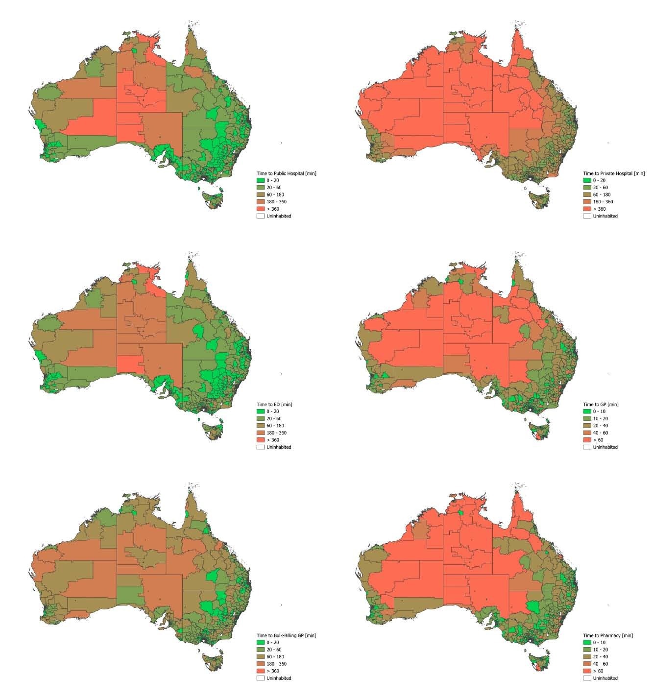Map of Australia divided into Statistical Areas Level 2 (SA2s), color-coded based on the shortest travel time to each type of health service.Map of Australia divided into Statistical Areas Level 2 (SA2s), color-coded based on the shortest travel time to each type of health service.