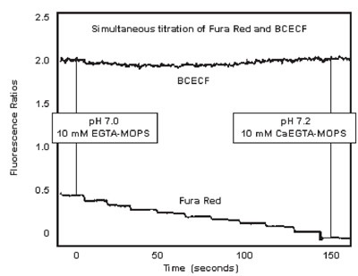 Moreover, the two parameters pH and [Ca++] must be measured independently, despite the spectral overlap between their emission spectra and fluorescence excitation.