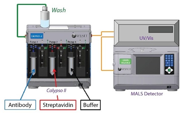 In the CG-MALS experiment, anti-streptavidin antibody (Amgen) and streptavidin (Sigma-Aldrich) are diluted to a final concentration of 10 µg/mL in a phosphate buffered saline consisting of PBS; 25 mM Na2HPO4, 25 mM NaH2PO4, 50 mM NaCl, 200 ppm NaN3 pH 6.7 for a total of ~100 µg protein for each experiment. Whatman Anotop syringe filters were used to filter each solution to 0.02 µm, and the resulting solutions were fed into a Wyatt Calypso® II composition-gradient system. The system prepared and supplied a variety of protein compositions and was fitted with an inline UV/Vis detector (Waters) and a Wyatt DAWN® HELEOS® MALS detector (Figure 1).