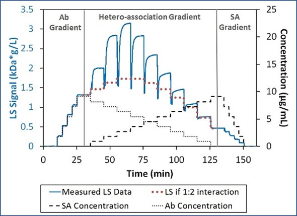 The intensified light scattering signal in the area of hetero-association gradient demonstrates the binding of Ab and SA to give complexes with a molecular weight greater than that of a 1:1 or 2:1 stoichiometric ratio, as shown in Figure 2.