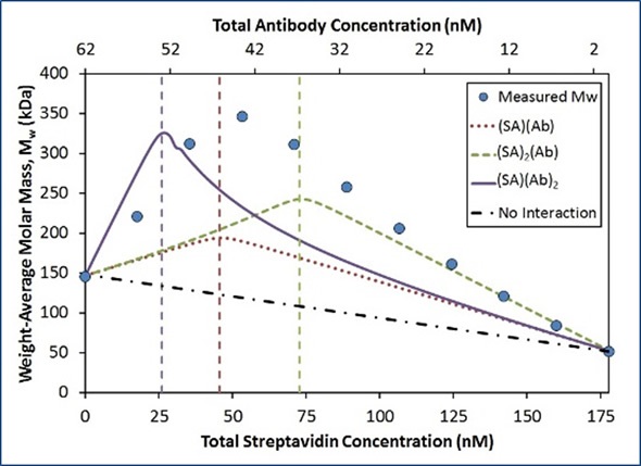 In Figure 5, the best fit (red unfilled circles) for the measured light scattering data (blue filled circles) shows contributions from ISA, (SA) (Ab), and (SA)(Ab)2 species. The purple squares show the overall contribution to the model by all species with stoichiometry [(SA)(Ab)]n with n>1.