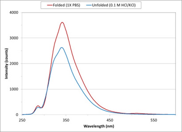 On exposure to 0.1 M HCl/KCl solution, the conformational state of the protein changes to expose the tryptophan and tyrosine amino acids to the solvent. As the protein moves from a folded state in 1X PBS (indicated by the red curve) to the unfolded state (indicated by the blue curve), the intensity of the fluorescence spectrum decreases and peak fluorescence moves to a shorter wavelength.