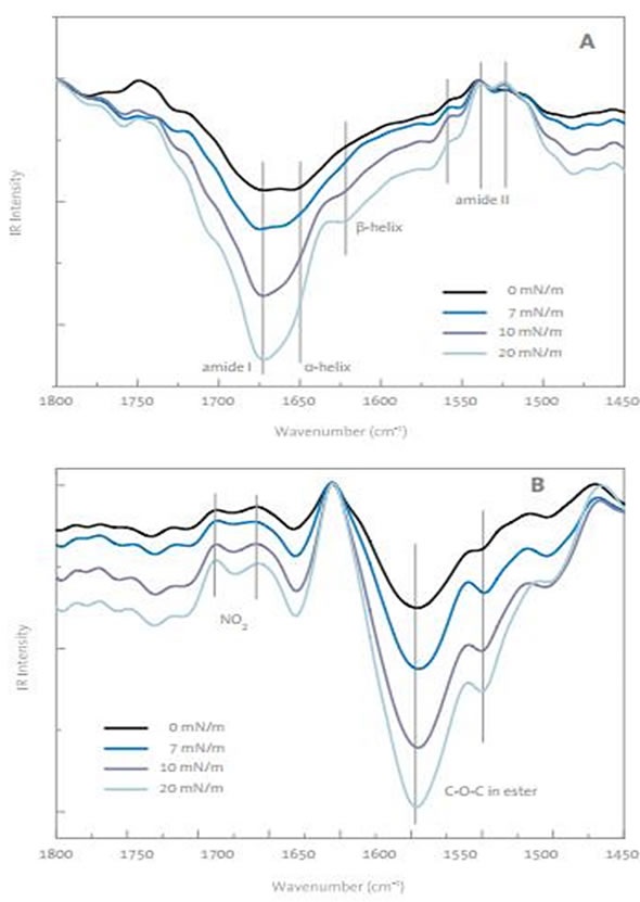 Measurement of this monolayer by PM-IRRAS revealed negative peaks for amides, which suggested disorganized amide groups at a surface pressure of 7mN/m or less, as indicated in Figure 2A. The negative intensity for the amide suggests that the C=O groups are located parallel to the monolayer surface. Further compression of the surface caused the amide I band for beta-sheet to become more pronounced, suggesting an intermolecular relationship between the drug molecules. Given that the bands of ester and nitro-groups (Figure 2B) do not alter in their sign or position, the drug’s directional changes can be eliminated as a cause of the decline in the surface pressure isotherm. Also, the measurements of dynamic surface elasticity support the development of organized domains in the monolayer at the peak in the isotherms.