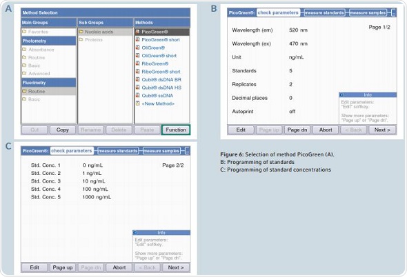 Figure 6. Selection of method PicoGreen (A). B: Programming of standards C: Programming of standard concentrations.