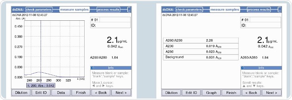 Photometric measurements can be performed using Eppendorf UVettes. The blank solution can be the freshly made 1 x TE buffer. The dsDNA method is chosen for individual photometric measurements. Figures 4A and 4B show the following settings: