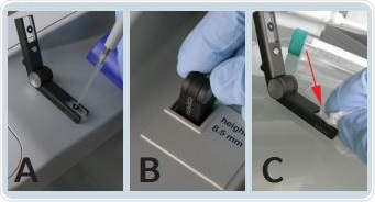 Contamination of the sample application area can be avoided by using gloves during the measurement process. Frozen samples should be thawed completely and mixed thoroughly for experiments using the µCuvette similar to analyses with standard cuvettes featuring a 100 light path. The temperature of the sample and the µCuvette needs to be the same at the start of the measurement.