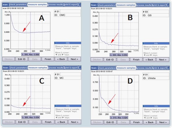Figure 7. Comparison of autoabsorbance of the µCuvette with that of other cuvettes. The red arrow indicates the autoabsorbance of the cuvette at 260nm: A) Microcuvette by a competing manufacturer B) Quartz cuvette C) µCuvette D) UVette
