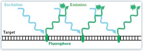 Fluorescence-based detection methods are capable of quantifying considerably smaller nucleic acid concentrations. In this method, the target molecules are detected indirectly by using a fluorescent dye. A standard curve is used for determining the sample concentration. Fluorescence-based measurement techniques provides more specific results because the fluorophores emit fluorescent light only when they are associated with the target molecule. There is also an increase in sensitivity via fluorescence measurements. Figure 1 shows the principle behind fluorescence measurements.