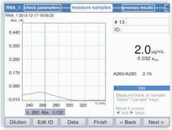 It is evident from Figure 3 that parameters can be validated and/or modified as per the requirements through method selection. The maximum absorbance on the measured RNA curve was observed at a wavelength of 260nm. Figure 4 shows an example of the result.
