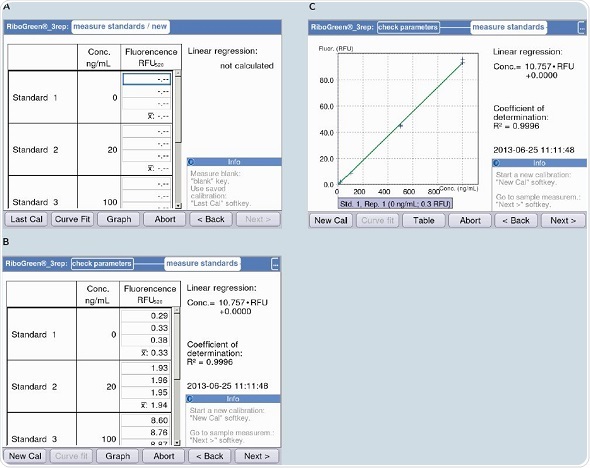 Figure 7. Measurement of the standard curve with the example of the RNA quantification kit “Quant-iT“(Life Technologies). Regression accuracy is displayed during measurement (R2 value). A) Beginning of measurement of the standard curve. B) Table format display of the standard curve. C) Graphic plot of the standard curve.