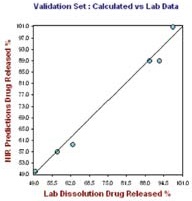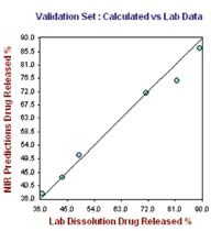 The right hand plot in Figure 4 shows the prediction model validation for which one tablet was not taken for the calibration set at each level. The plots of the NIR predictions of the calibration set and validation set against the lab results for 12 hours and 24 hours are depicted in Figures 5 and 6, respectively.