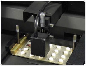 The analysis was conducted on five batches of tablets with a diameter of 0.25-inches and weight of 100mg. Each tablet of a batch was formulated with 0mg placebo tablets, and 0.1, 0.5, 1.0 and 2.0mg of chlorpheniramine maleate (CPM), and subsequently compressed into tablets on an Elizabeth-Hata HT-AP 18 SS-U/I rotary tablet press. For this experiment, NIRS XDS MasterLab was used for NIR measurements. This instrument can automatically measure multiple tablets once they are placed in a special tray (Figure 1).