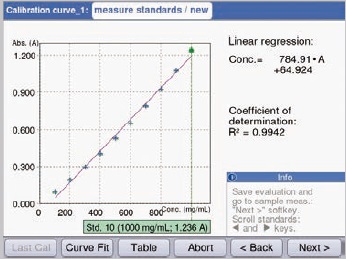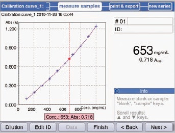 On establishment of the standard curve, initiation of sample measurement takes place immediately. The “Next” soft key directly leads to the area of measurement. Figure 12 shows an example of a sample measurement. The resulting measurement of the sample is directly displayed within the curve’s standard in Figure 12. This shows the range of standards selected coherently for sample determination.