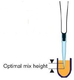 of the liquid column of a well or higher, is the most efficient mixing height. Ideally, during the mixing process, the liquid is dispensed on top and then aspirated from the middle. This can prove to be tricky if performed manually, and so care should be taken not to remove the tips from the liquid at the time of mixing to avoid air being drawn in.