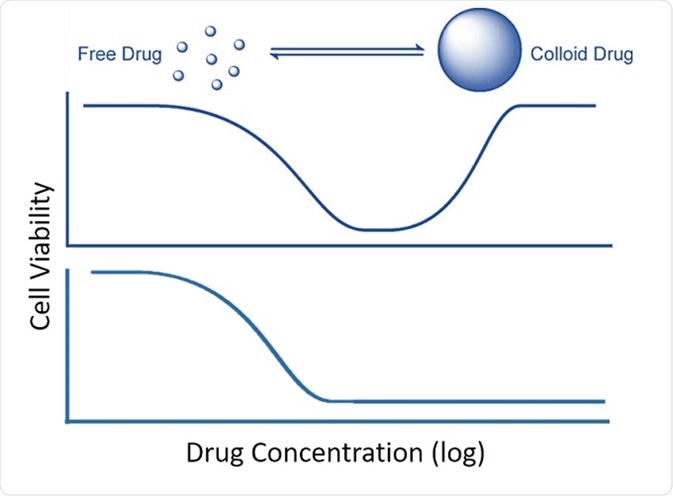 Colloidal aggregate formation is believed to occur in a highly concentration-dependent way (Coan and Shoichet, J. Am. Chem. Soc. 2008, 130, 9606–9612), and according to the research team this behavior is responsible for the unusual response curves, i.e., the “bell-shaped” curve, shown by some compounds: the drug seems to have a high effect at low dose, but loses its efficacy at higher concentrations (Owen et al., ACS Chem. Biol. 2014, 9(3), 777–784).