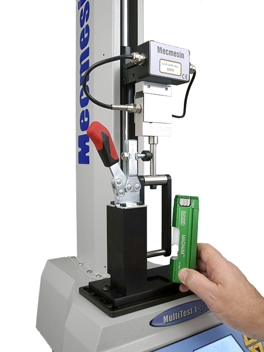 To meet this requirement, two MultiTest 1-i test stands were supplied by Mecmesin, with a bespoke grip system for holding the sample. The gun to be tested is securely clamped into position, while the cocking slide is engaged by an upper stirrup.