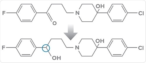 The conversion of haloperidol to a chiral product via achiral metabolism (carbonyl reduction) (S-hydroxy-haloperidol is preferred in humans) (above);