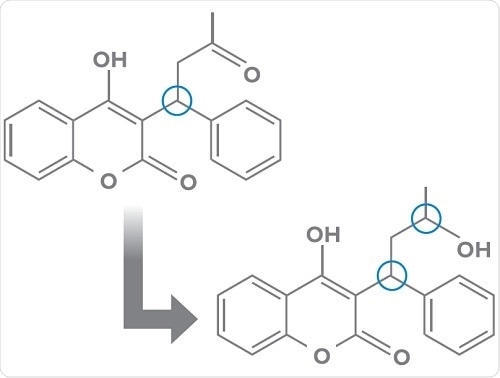- Chiral to diastereomer conversions such as transformation of warfarin to two pairs of diastereomeric alcohols via keto-reduction (below);