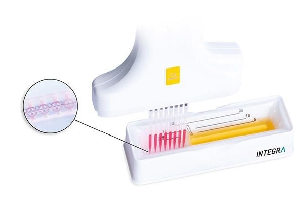 However, as soon as one of the tips of a multichannel pipette begins aspirating air, the remaining liquid in the other tips becomes dead volume. Integra has developed a reservoir combined with two innovations: unique surface treatment and the SureFloTM anti-sealing array to combat this problem.