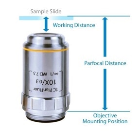 The parfocal distance is the distance between the position where the objective is mounted and the focal plane of the specimen. Theoretically, objectives which have the same parfocal distance but different magnifications can keep the same focus, even if the magnification is changed from one level to the next.