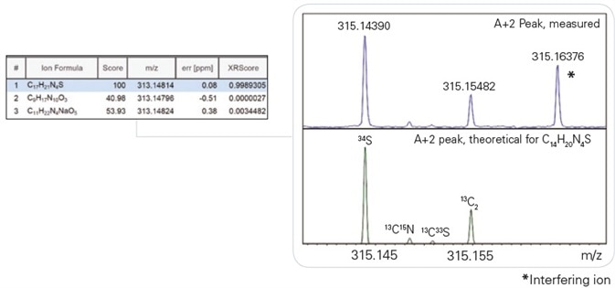 Isotopic Fine Structure of A+2 is compatible with the theoretical IFS pattern of the correct formula.