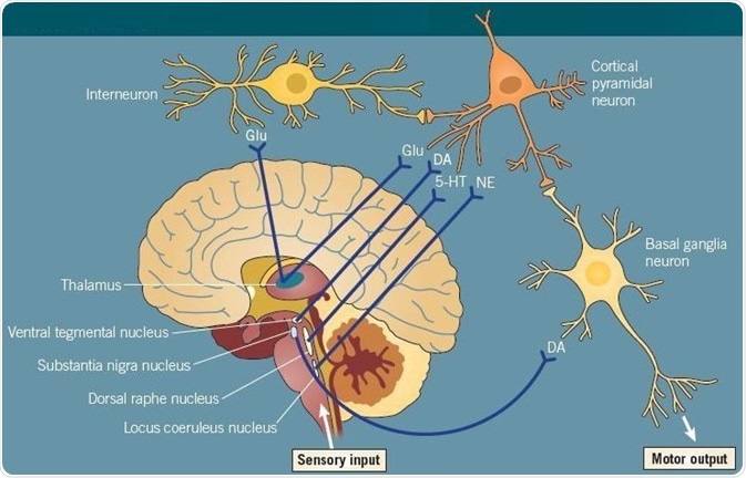 Antipsychotics modulate the release of acetylcholine from the basal forebrain nucleus, while they also heighten interneuron activity by blocking noradrenaline (NA) receptors in the locus coeruleus. Interneurons in the frontal cortex regulate glutamate release and hence the excitation of cortical pyramidal neurons.